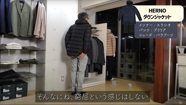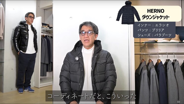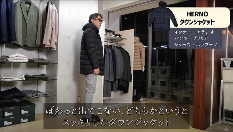 まず最初に、ダウンジャケットの選び方についてです。今回着ているのは、テカリの少ない、スッキリとしたシルエットのヘルノ(HERNO)のダウンジャケットです。