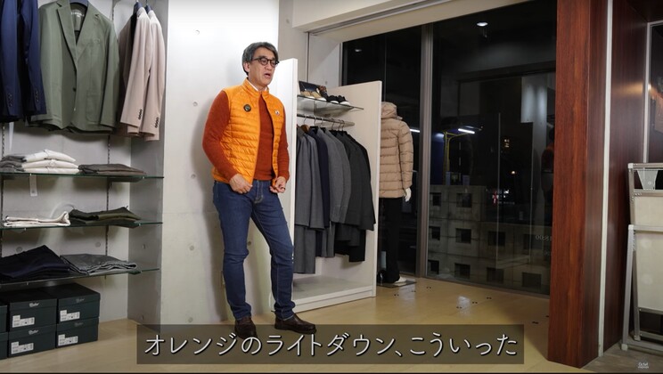 特に今回のようなオレンジのライトダウン、カジュアルなライトダウンを使うときは、色のアイテムを選ぶ方も多いと思うんですが、こういったアイテムもカジュアルな雰囲気の中では組み合わせとしてはありなんですが、ちょっとガチャついてしまいがちですよね。例えばこのコーディネートでは、テーパードが利いたヤコブ コーエン(JACOB COHEN)のきれいめエレガントなデニムにローファーを合わせているので、このライトダウンは相性が良くない感じなんです。