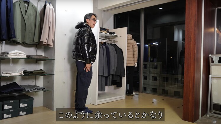 最後のポイントとしては、レザーのシューズを選ぶことで印象がぐっと変わることですね。特に、裾幅が太めのパンツとレザーシューズの組み合わせは、大人の男性にはあまり相性が良くないので、裾幅が細めのパンツにレザーシューズを合わせると、全体的にすごくカッコよく仕上がると思います。さらに、ダウンジャケットのボリュームを抑え、少し長めで、光沢感が少ないマットなものを選ぶことで、エレガントさが増すんじゃないかなと感じています。