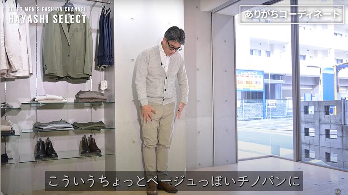 例えば、ベージュ系のチノパンに白シャツ、そしてカーディガンを合わせたスタイル。こういった着こなしは、どうしても少しおじさんっぽく見えてしまい、洗練されたおしゃれな印象にはなりにくいのではないかと思います。いくつかポイントがありますが、特に白シャツにカーディガンを合わせるスタイルは、意外とバランスを取るのが難しいものです。今のような胸元の開いたカーディガンの場合、シンプルにハイゲージのニットやコットンニット、またはカットソーの方が、すっきりとまとまりやすいのではないかと思います。