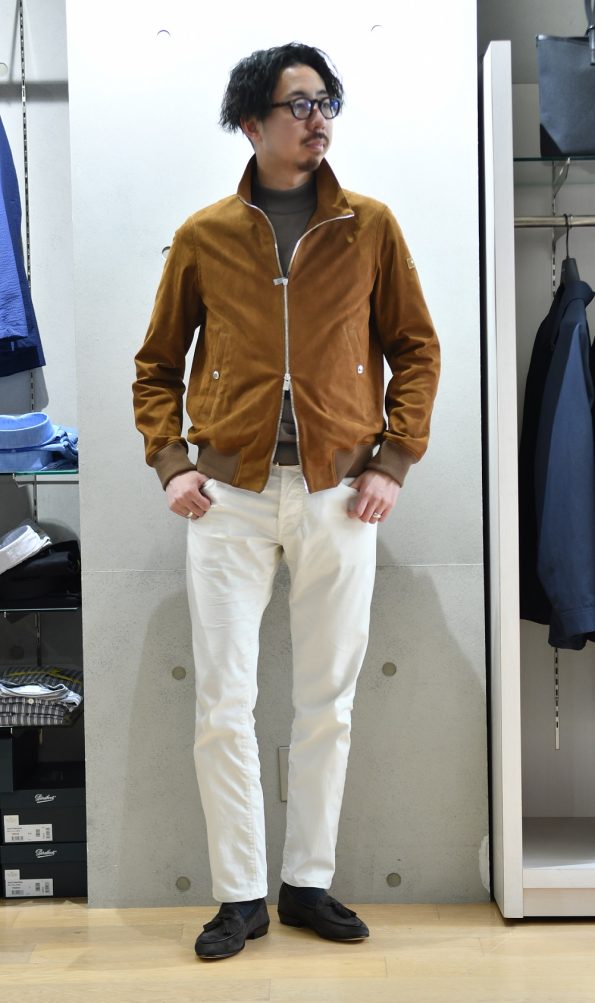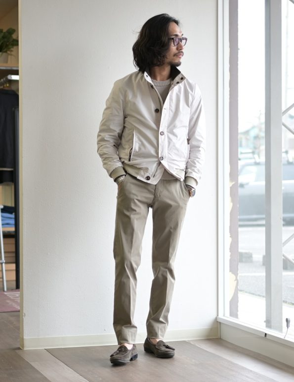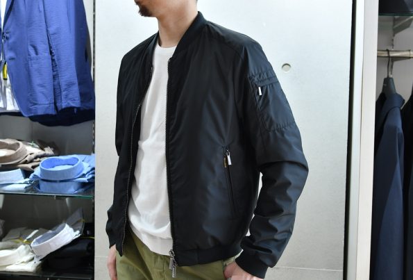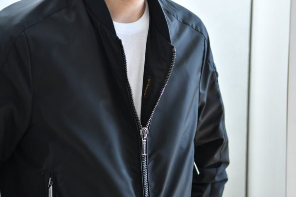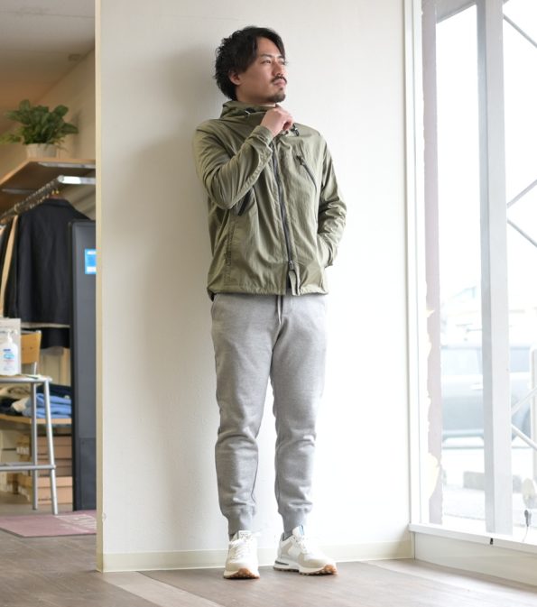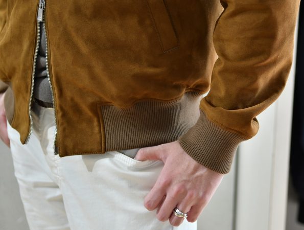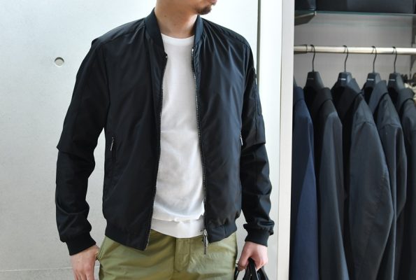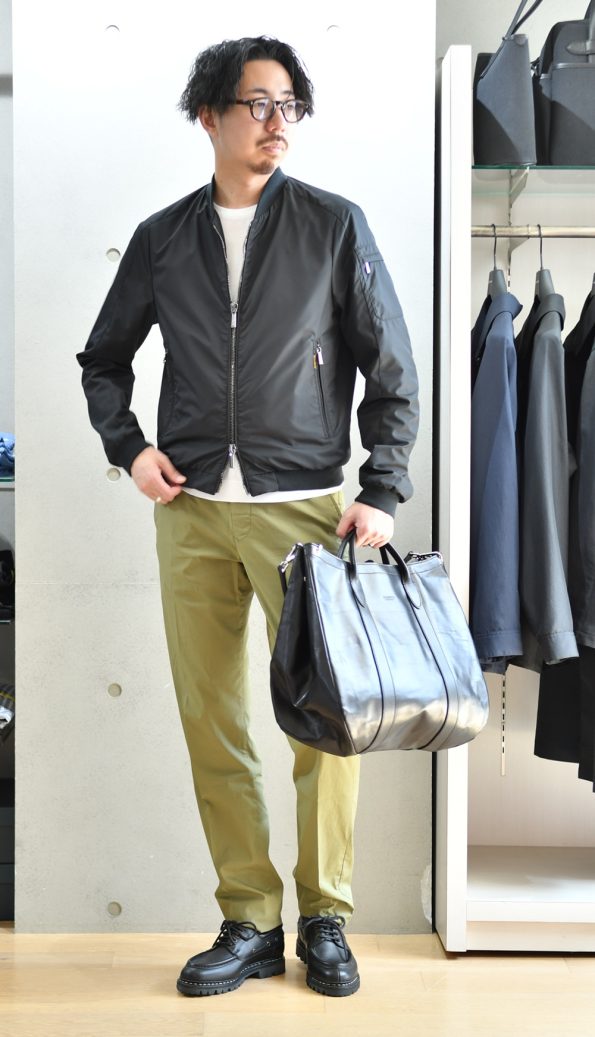 とにかくエレガントなMA-1!流行りのゆったりシルエットではなく、袖や裾のリブの太さなどシャープな作りなので、ライダースのようにバチっとカッコよく着こなして頂けます。カーキ色のイージースラックスであれば軍物ベースのMA-1の雰囲気とムーレー特有の上品な雰囲気にピッタリですよ!