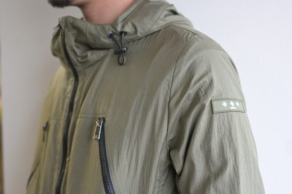 独特な光沢感と、特殊加工で実現するシワ感がたまらない一着です。撥水加工までもほどこされており、機能面も優秀。