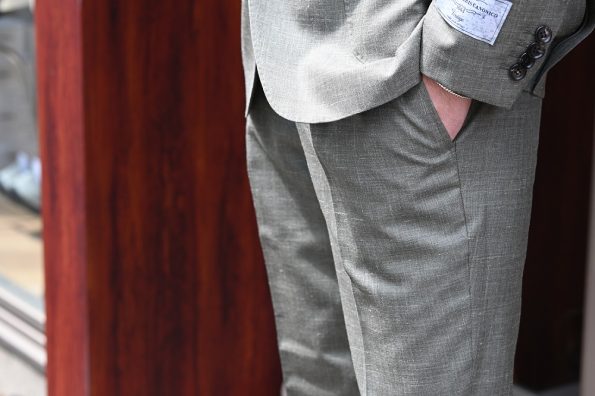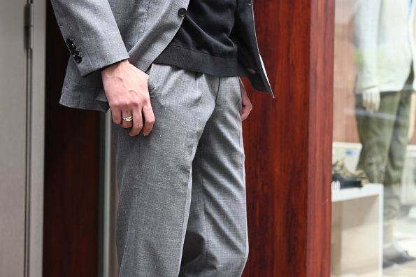 リネン×サマーウール×シルクの3者混素材を使用したセットアップになります。リネンらしいシャリ感を残しつつも荒っぽくなり過ぎず柔らかいドレープと光沢感が魅力。