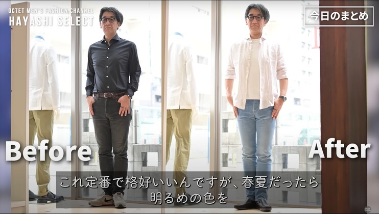 ということで、次にシャツスタイルですが、黒と比べるとものすごく軽快なイメージになっているんじゃないかなと思います。ポイントとしては、リネン素材のシャツを選んでほしいということです!