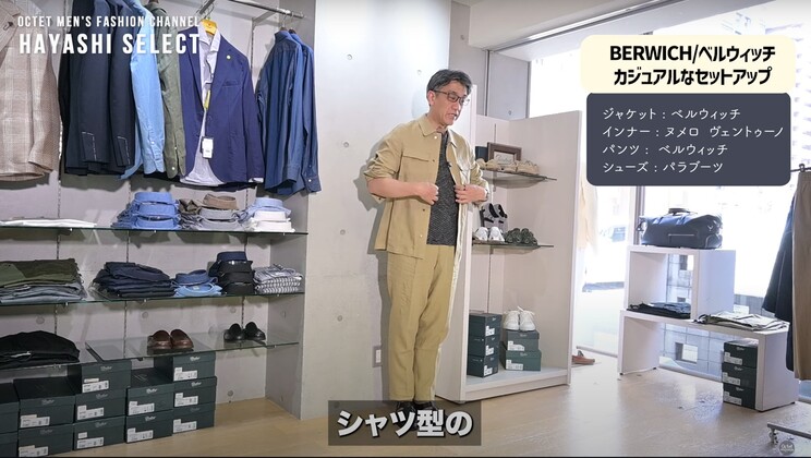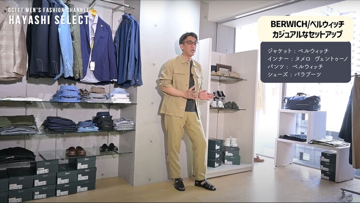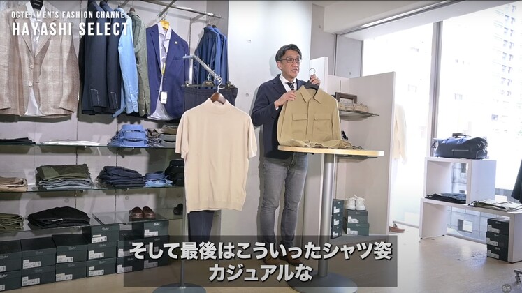2つ目は、テーラードジャケットじゃなくて、シャツ型ジャケットとパンツの組み合わせでのセットアップ。もちろんセットアップじゃなくてもいいんですが、シャツ型の軽いアウターが、今年の春夏は新しい定番になっていると感じています。