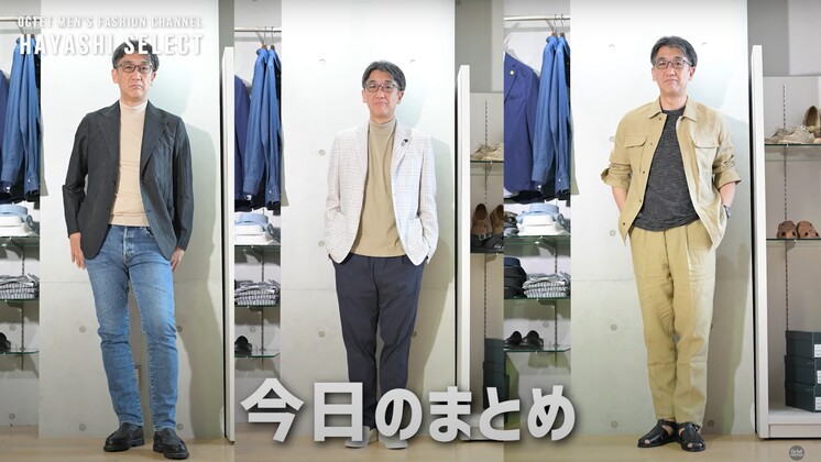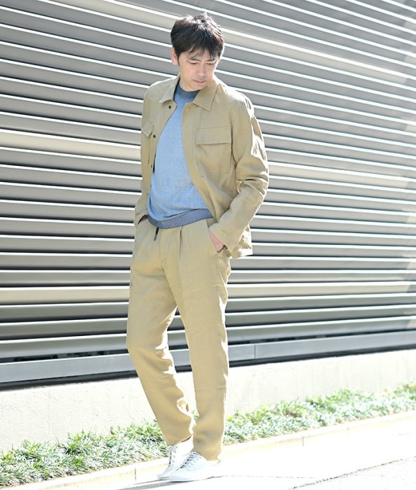 それから、こういったサンドベージュだったりリネンの麻感のあるトップスの場合、ボトムスを変えてもすごく合わせやすいと思うので、デニムだったりダークトーンのチノとか綿パンと合わせていただくと、すごくかっこいいコーディネートになります。セットアップの良さは、バラバラでもかっこよく着こなせるっていうところもありますので、そんなところも加味しながら、ちょっと新しい定番的なセットアップアイテムをセレクトしてもらうのもかっこいいと思っています。