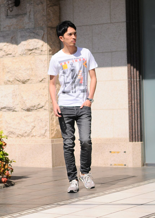 グレーなど落ち着いた濃い目のパンツで合わせると