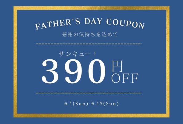 また、『父の日』といたしまし期間限定で使用出来る390円OFFクーポンも配布しております。画像からLINEのクーポンを獲得出来ます。ぜひ、この機会にご活用下さい。