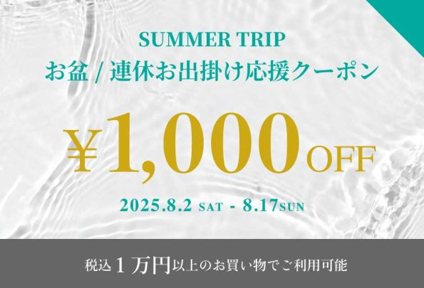 只今当店では、お盆や連休に向けてのお出かけをサポートする為に【お盆/連休お出掛け応援クーポン】として、1000円OFFのクーポンを配布しております。夏のお出かけ前の準備に、ぜひご活用ください。