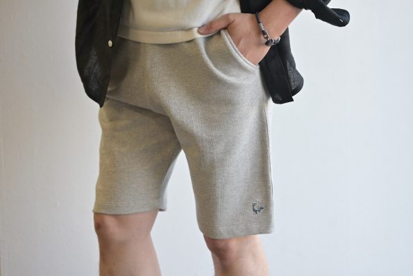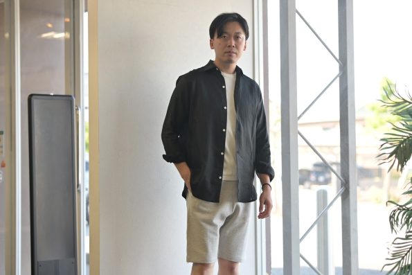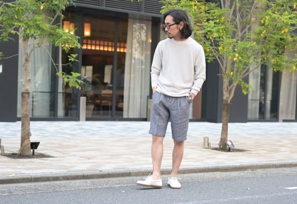 特にニュアンスのあるライトグレーは、コーディネートを洗練された印象に引き上げてくれます。ハーフパンツと合わせて、リラックス感のある大人の休日スタイルをお楽しみください。