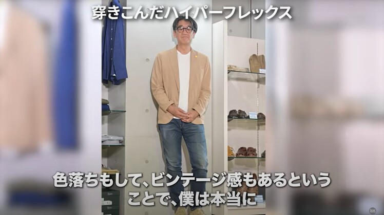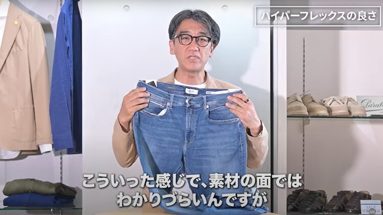 今はまだ暑いので、秋の新作って言われるとピンとこないかもしれませんが、先にイメージしておくのもいいと思います。特にこのハイパーフレックスのデニムはストレッチがすごく効いていて、今の時期からでも穿ける一本なんですよ。だから季節を問わず着られるのもポイントです。