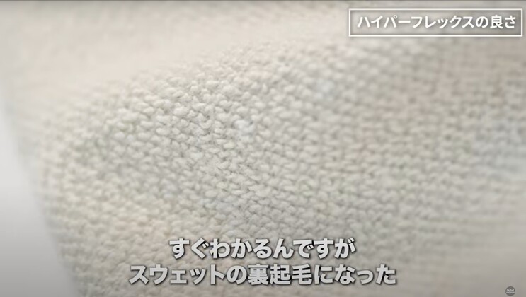このハイパーフレックス素材の良さは、もちろん縦横にしっかり伸びることです。とてもよく伸びるんですね。それに加えて、デニムと同様に色落ちが進み、体に馴染んでいく過程も楽しめるのが特徴です。ジョグデニムやスウェットデニムと比べても、圧倒的にキックバック、つまり伸びて戻る力が強いため、膝が出たり破れたりすることが非常に少なく済みます。