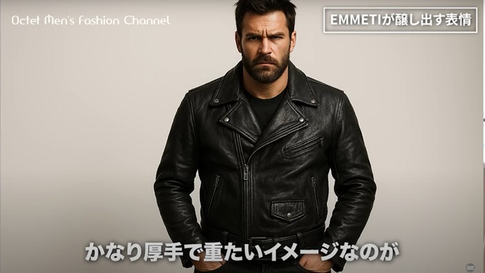 ちょっとゴツめのディテールがあったり、革も厚手で重たいイメージがあるのが、一般的なレザーブルゾンの印象だと思います。ですがエンメティ(EMMETI)は、大人が着てもすごく綺麗でエレガント、しかも軽くて着心地のいいレザーを作ってくれました。