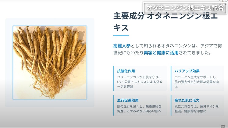 これはニンジンの一種のエキスです。抗酸化作用がある成分と言われていて、ハリや弾力をサポートしてくれます。