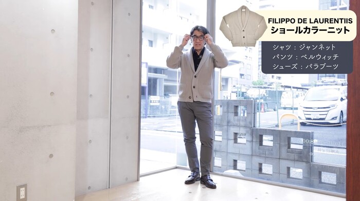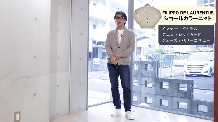 個人的には、ショールカラーのニットカーディガンをジャケットのように着こなす場合、シャツも選択肢のひとつになると思っています。ショールカラーの良さのひとつは、首元がV字に広く開いていること。これにより、シャツとのコーディネートもしやすくなるのが魅力です。