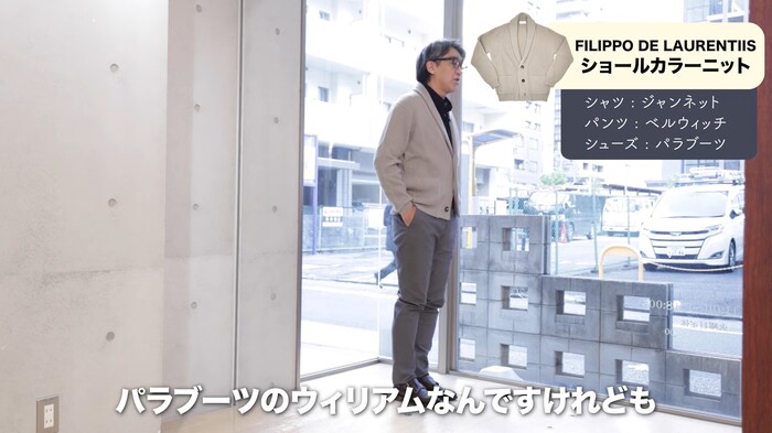 今回はパラブーツ(Paraboot)の『ウィリアム』を合わせていますが、ドレス寄りのシューズを選ぶほど、コーディネート全体がぐっとエレガントに見えます。このスタイルなら、ビジネスシーンでも問題なく通用するくらいきちんとした印象になりますし、ニット自体も暖かいので、昼間ならこのまま外出しても全然大丈夫ですよ!!