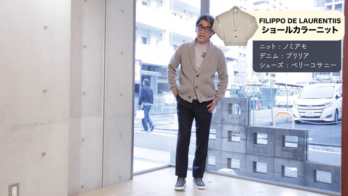 今回の最初のコーディネートでは、僕が以前からよく着ているアイテムも多いのですが、今回はアルパン(ARPIN)のジャケット、マロリージャケットを合わせています。このショールカラーのニットも含めて、長く着続けられるアイテムって、本当にカッコいいなと思っています。