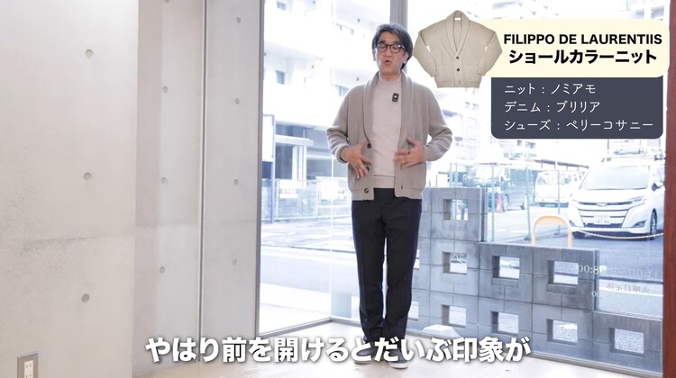 ジャケットと同じように、前を開けることで縦のラインがはっきりし、すっきり見えるんですよね。また、開けることでカジュアルな雰囲気にもなるので、閉めたバージョンと開けたバージョンでちょっとしたことなのですが、見え方のイメージを変えられるのも、カーディガンの魅力だと思います。