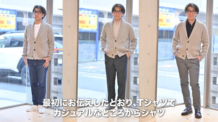 最初にお伝えしたとおり、ショールカラーカーディガンは、Tシャツでカジュアルに、シャツで少しキレイめに、さらにモックネックのニットとも幅広くコーディネートできます。ジャケットとカーディガンの中間としても使えるのでとても便利な使い勝手の良いアイテムになります。