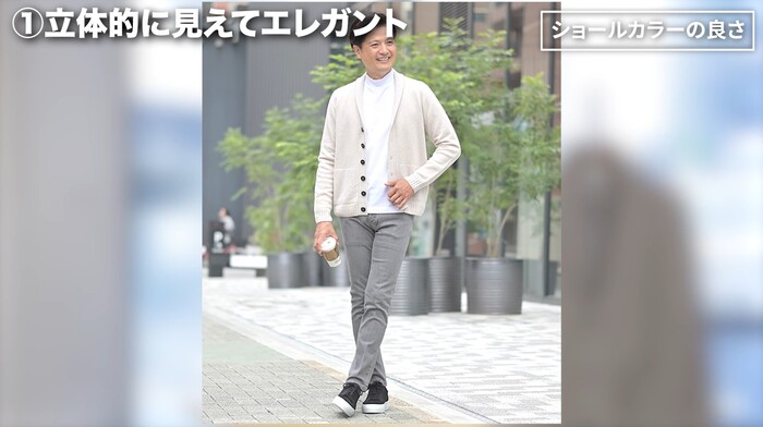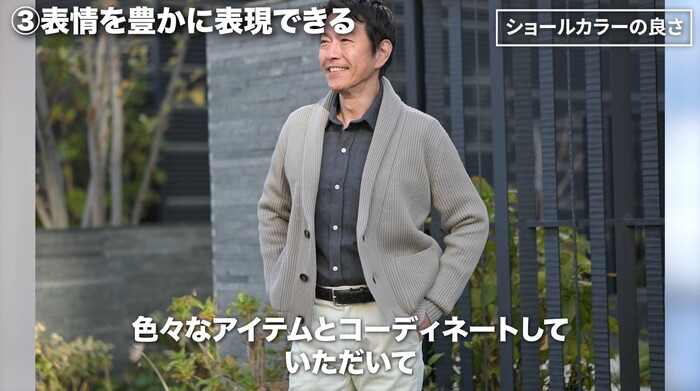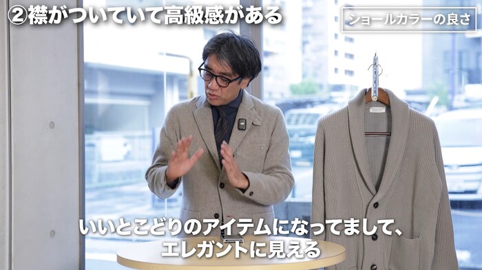 2つ目のポイントは、襟が付いていることで、ジャケットの良さとカーディガンの良さ、どちらもミックスした“いいとこ取り”のアイテムになっているところです。
