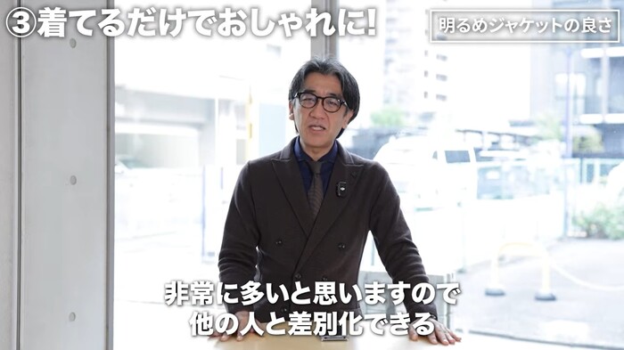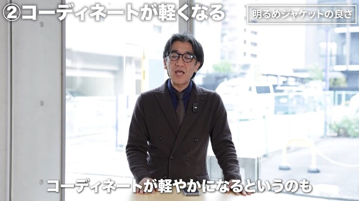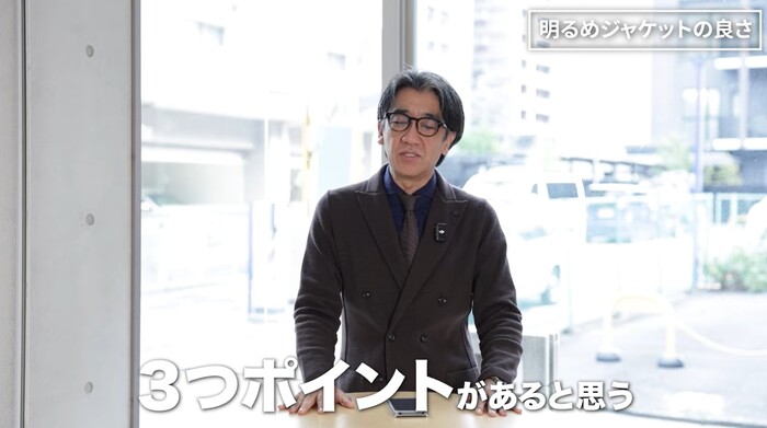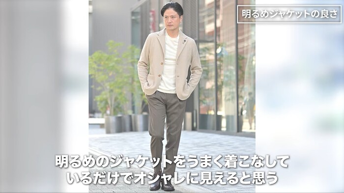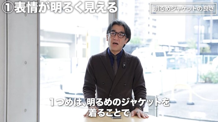 まず1つ目は、明るめのジャケットを着ることで、上半身が自然と明るく見え、それに引っ張られるように、表情まで明るく見えるところです。