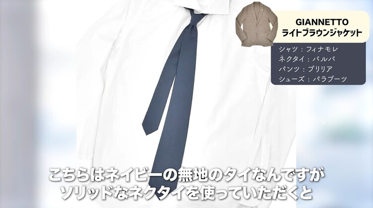 今回合わせているのは、ネイビーの無地のネクタイ。柄物のジャケットには、こういったソリッドなネクタイを合わせると、全体がすっきりとスマートにまとまります。柄のあるジャケットに、無地のネクタイ。この組み合わせは、ぜひ一度試してみてほしいですね。