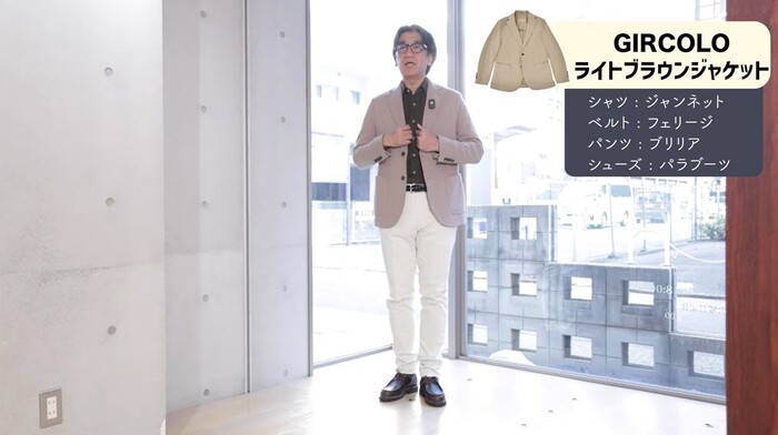 続いて2つ目のコーディネートは、カジュアルシャツにライトカラーのジャケットを合わせたスタイルです。