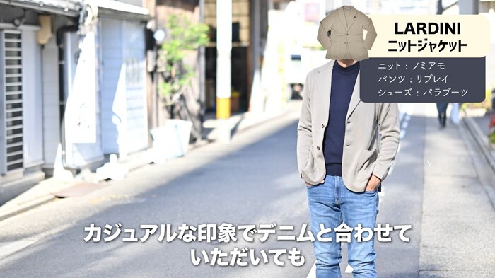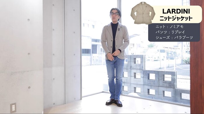 3つ目のコーディネートは、ベージュのニットジャケットをピックアップしました。アイテムはLARDINI(ラルディーニ)の定番アイテム。