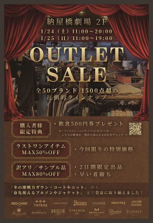今回は、半年に一度のBIGセールイベント”OUTLET SALE in 納屋橋COLORS.366″ のご案内です!!