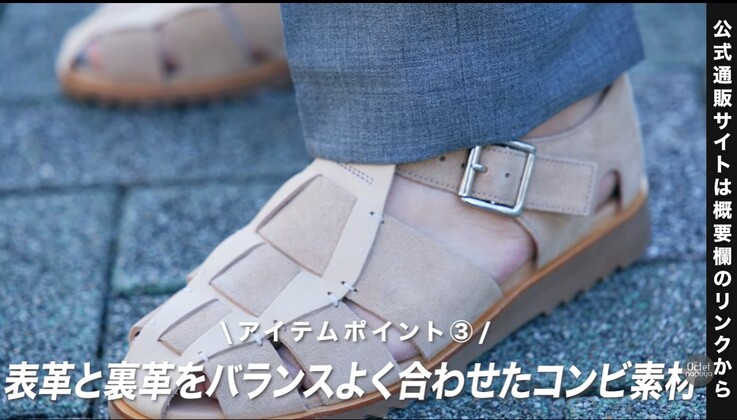 サンダルということで夏らしいアイテムになりますので、今回はリネンのシャツと合わせているんですけれども、こういった組み合わせがすごく大人っぽくてめちゃめちゃカッコいいなと思いますし、ぜひこの夏はリネンのシャツやシャツアウターのようなアイテムと、こういったサンダルを合わせてもらえるとすごくいいんじゃないかなと思います。