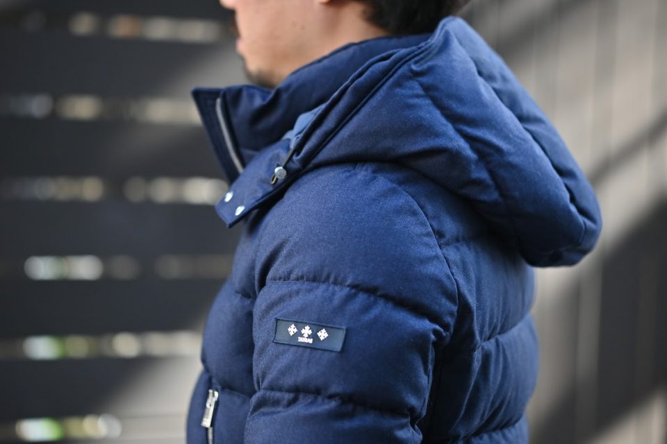 タトラスのダウンで使用される素材は「ナイロン素材」と「ウール素材」の大きく2つに分かれます。DOMIZIANO(ドミツィアーノ)は「ウール素材」を使用したダウンジャケットになっており、ナイロン素材の物と比較すると大人っぽく、綺麗な印象になります。パンツをデニム等のカジュアルなアイテムはもちろん、スラックスなどとの相性も抜群です。
