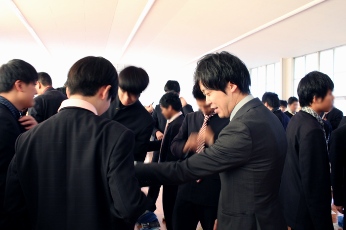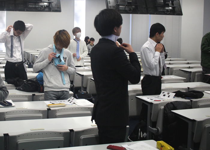 と総出でまずは絶対に必要となるネクタイの結び方を伝授しました!