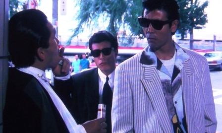 白ピンストのピークドラペル(ダブル?)ジャケットに、ド派手なアロハっぽいシャツ。