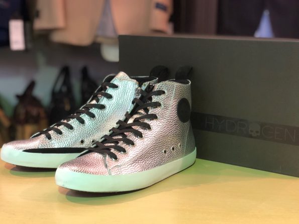 インパクト大!!ギラギラしたシルバーカラーが特徴的な一足。