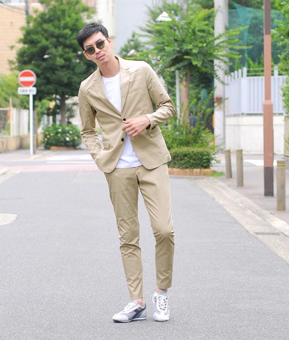 モダン&スポーティーさの強みを楽しめ、裏地がなく透けない、軽くて伸びるという3シーズンで堪能できる化繊素材。