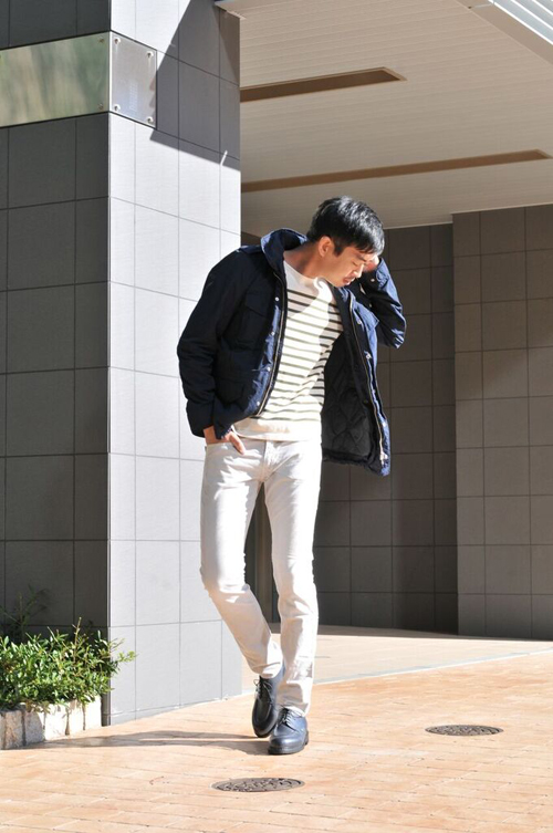 敢えてこの季節に白パンで合わせたコーデとなります。
