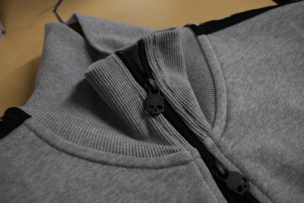 高さのあるスタンドネックのファスナー部分には、スカルのモチーフ付き。