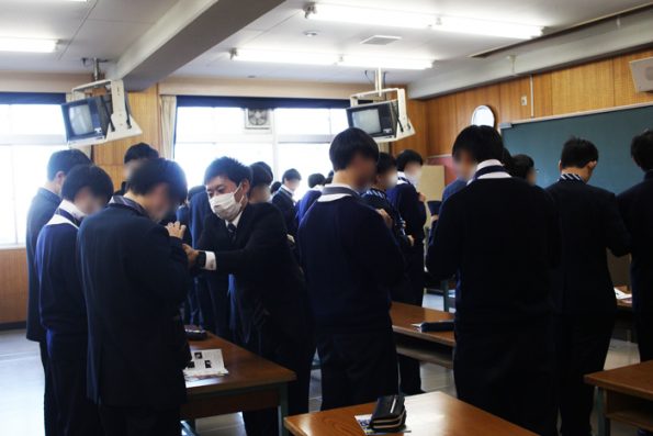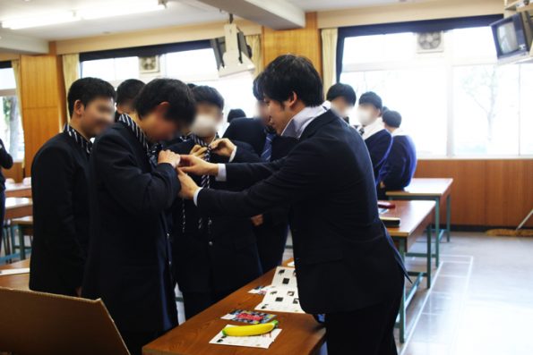 男子生徒はネクタイの結び方講義を郡山からレクチャー。