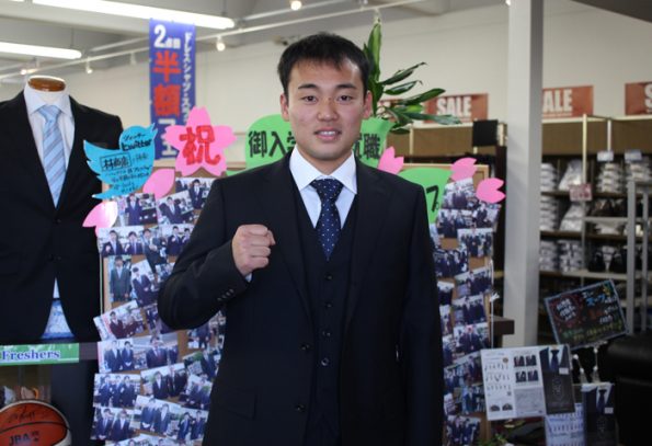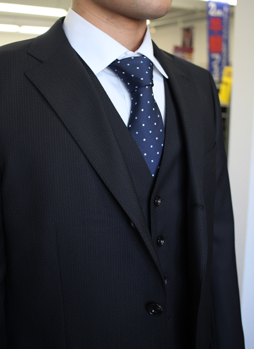 胸元には、ドット柄でネイビーのネクタイを合わせました。