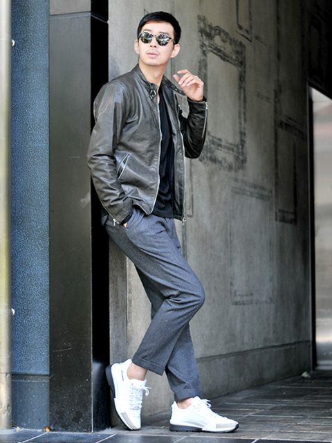 強いイメージが付き易いレザーは、デザインのあるデニムやカットソーは避け