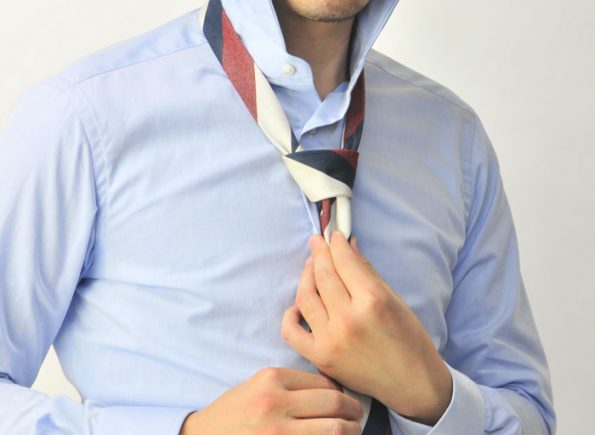 ⑥で出来上がった結び目をシャツ第一ボタンのところまで持っていきます。