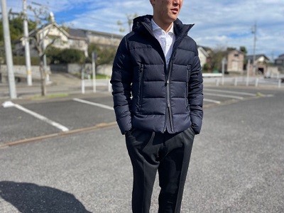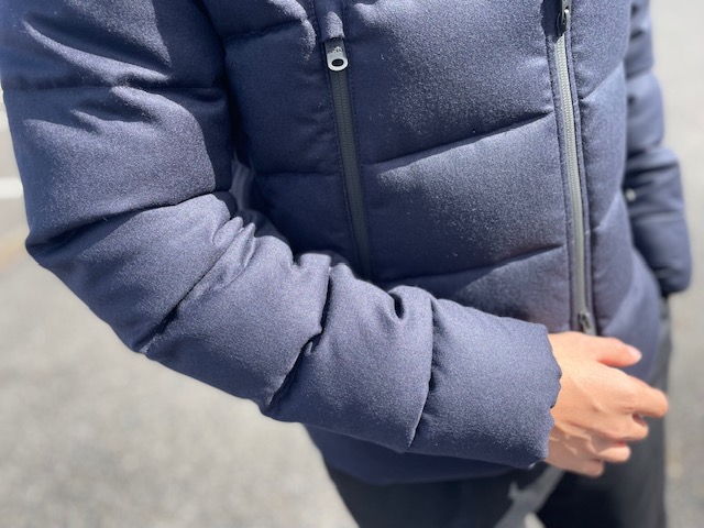着丈の長さに関してもお尻部分まで来ておりピッタリなサイズ感で、短すぎず、長すぎずといった丁度よい長さでした。また、コート型のダウンではないのでジャケットの上から着用すると、ジャケットの着丈が出てしまいますので、インナーはニットやトレーナー等が好ましいです。