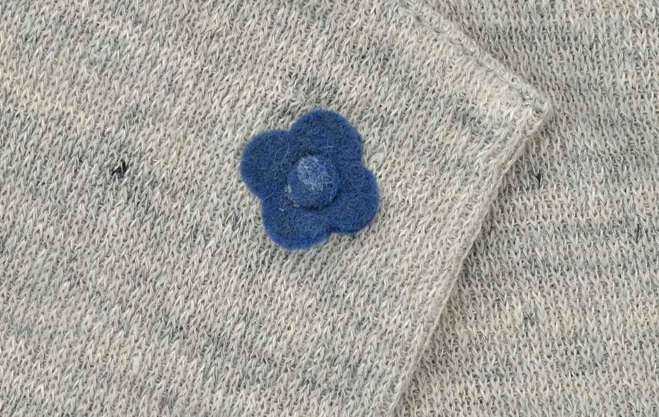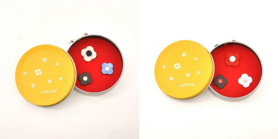 ラルディーニのシンボルのブートニエール。フェルト、ウッド、天然貝の3つの素材を使用した3個セットのアイテムとなります。