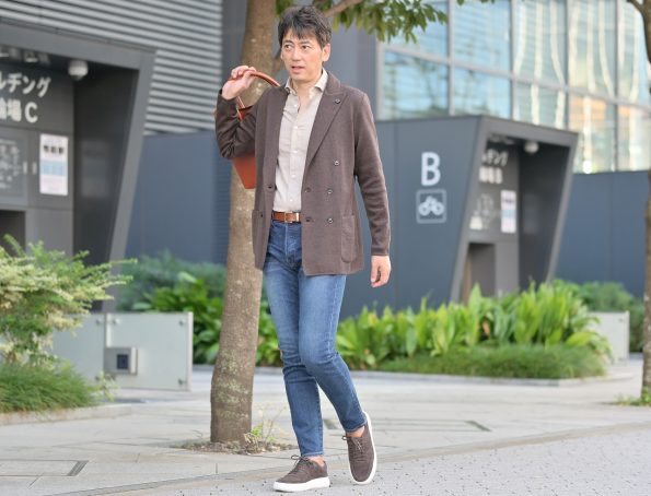 今回は、デニムを合わせ足元もスニーカーでキレイ目なカジュアルスタイルにしております。ミドル世代の男性にはカジュアルなスタイリングの中にも上品さを感じる着こなしがオススメですよ。