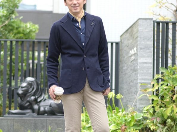 ダブルブレストにニットジャケットを使ったコーディネートになります。ニットジャケットは、カジュアルなボトムスとの相性も良いですね。