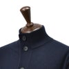 柔らかくも自立したスタンドネックが特徴的で、程よい厚みのある襟が首元に優しく寄り添い、フェイスラインをすっきりと整えます。シンプルな装いにこの襟元が加わることで、印象は一気に洗練され、都会的なムードを演出します。