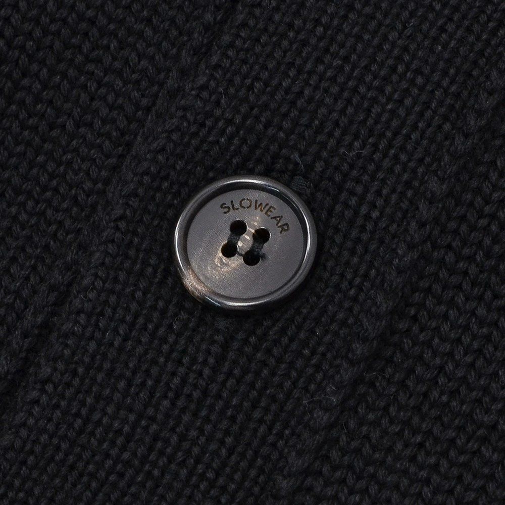 前立てに並ぶ8つのボタンが編み目の上でアクセントになり、見た目にもメリハリをプラス。ネックや袖口、裾に配されたリブが全体を引き締め、ボタンを閉じても開けてもサマになる、大人の上品さを感じる仕上がりです。