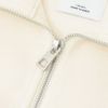 胸元にはブランドのアイコン刺繍をさりげなく配置し、控えめながら存在感を放つアクセントに。襟は立てても折り返しても着用でき、ジップの空き具合でちょっとした表情の変化をつけて、スタイリングの幅を広げてくれる万能なネックデザインです。