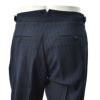 ベルトループの無いベルトレス仕様であり、ウエストのフィット感を高める3点留めフロントや屈んだ時の窮屈感をサポートしてくれるV字スリット、長めの持ち出しや山なりのウエスマン、内側のパイピング補強といったサルトリアの仕様が、ウールファブリックに合わさり、ドレスライクな見え感を作り出しております。