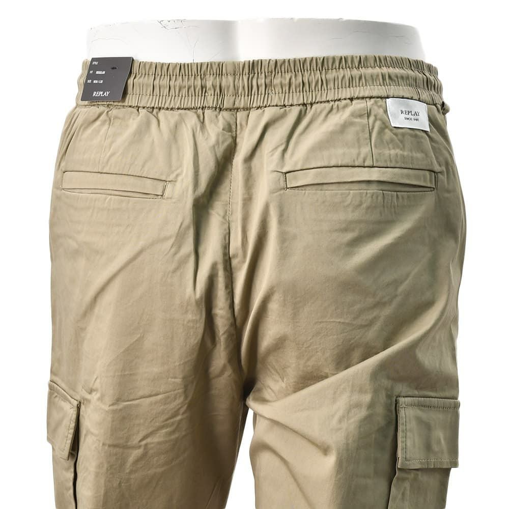リプレイ REPLAY コットンパンツ メンズ ストレッチツイル生地 ウエスト調節可能バックル ブラウンベージュ ガーメントダイ カーペンターパンツ レギュラーシルエット カーゴ型ポケット 国内正規品 でらでら 公式ブランド